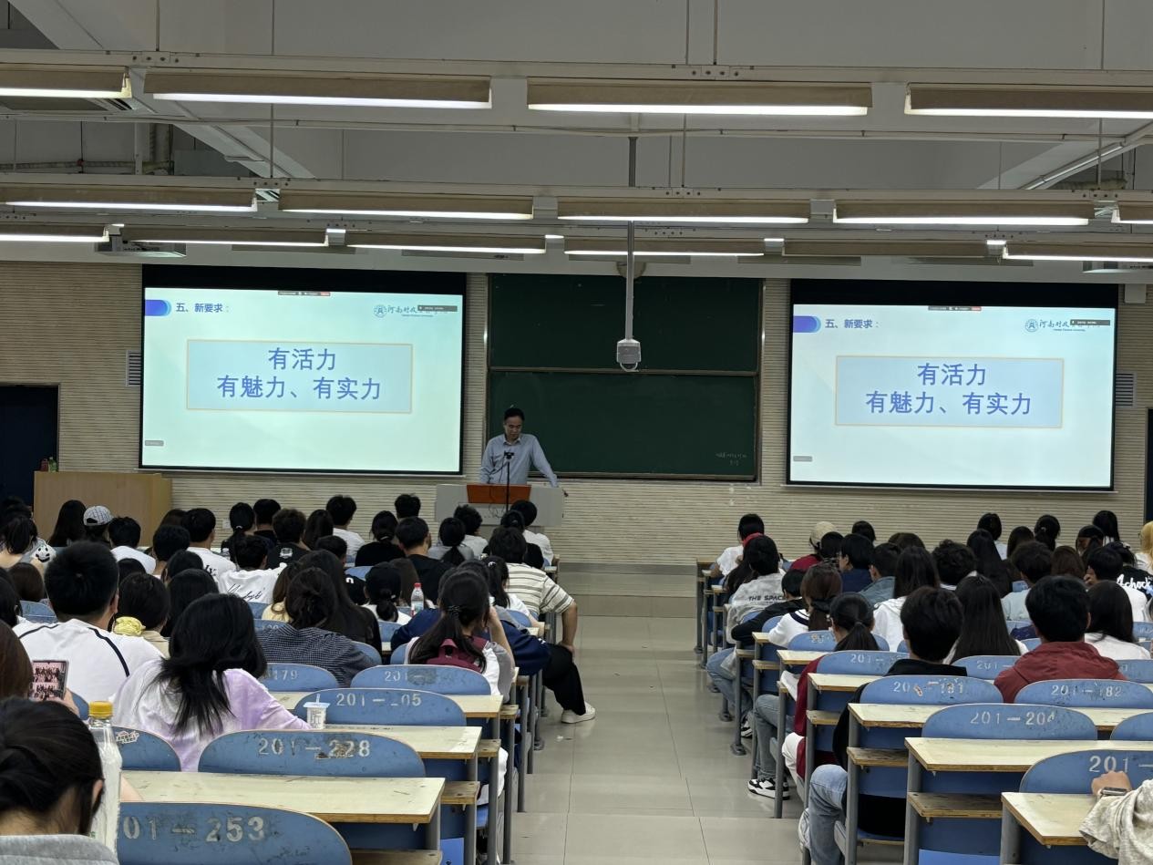 会上,韩书记以“成人成才”为主线,为全体新生带来一场立意深远、情真意切的成长寄语。他围绕“锤炼专业实力、彰显人格魅力、迸发青春活力”三个维度,系统阐释了新时代软件人才的成长路径。他指出,“实力”是立足未来行业发展的根本根基,需掌握核心技术;“魅力”体现在健全人格的塑造与高尚品德的养成,要成为有温度、有情怀的追光者;“活力”是青春特质,更应转化为持续成长的动能,鼓励大家主动投身科研创新、文体活动与社会实践,始终保持昂扬向上的奋进姿态。